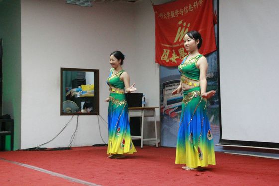 首先出场的是信安141班的《红尘客栈》,悦耳动听的歌曲配上穿插其中的精彩绝伦的武术表演,让14级新生们精神为之一振,现场气氛顿时燃烧起来,变得高涨。就在大家意犹未尽的时候,数学143班献上了舞蹈《Our show time》,6位小女生代表班级卖力的演出得到了大家的一致掌声与肯定。数学142班的歌曲串烧《新贵妃醉酒+我相信》无疑是这场晚会的亮点之一,2班男男组合的“新贵妃醉酒”让晚会达到了高潮,演唱堪比李玉刚,而女生版合唱“我相信”也唱出了不同的韵味。
