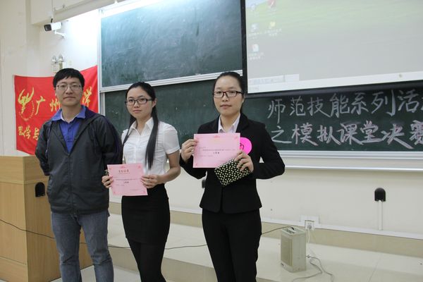 2014年4月1日,师范技能活动之模拟课堂总决赛于文清201课室取得圆满结束!本次比赛我们邀请到学院汤志娜、陈刚毅、陈启彪三位老师担任评委。进入决赛的十位选手在讲台上充分展现了各自优秀的一面,经过激烈角逐,评选结果终于揭晓,何思薇荣获本次比赛的第一名,刘仁、简舒曼名列第二、第三名,邓丽芬、吴雪容分别获第四、第五名,黄靖怡、尹淑芬、吴惠琴、杜家荣、林佳玮五位选手获优秀奖。