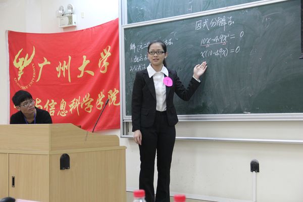 模拟课堂是每一位即将走上教师岗位的师范生进行实践教学能力的舞台。本次活动从教学目标、教学内容、教学方法、教学课件与板书、教学仪态、教学创新、语言表达、课堂气氛和效果等方面对参赛选手进行点评。每一位选手在赛前都精心准备了自己的绝招,并在比赛中展现出来,力求出奇制胜。有的选手善于在讲课中融入一些幽默因素,以增强与台下同学之间互动性;有的选手能够着眼于解题方法的精简与创新以力求达到深入浅出的教学效果;有的选手兼顾板书与课件,使二者达到互补效果并且整洁清晰的板书加以清晰的讲解使台下的同学更易于跟上其思路……在每位选手授课完毕之后,由评委老师对该选手的表现进行提问,台下观众也因此见识到了名师指导的风采。