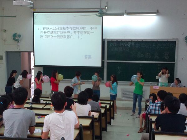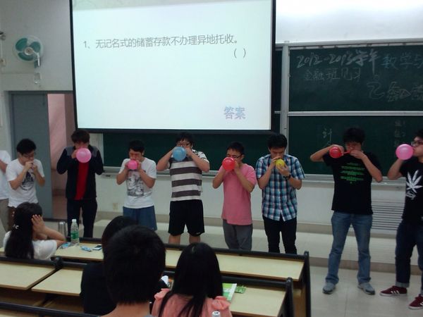 在老师的指导和班级干部的精心策划下,下午3点半,金融知识竞赛如期举行。本次竞赛共分10支队伍,活动形式新颖,竞赛环节分为热身抢答题、必答题、风险抢答题三个环节,题目难度适中,对思维能力要求较高。在热身抢答题中,各小组派一名代表到讲台前吹气球。最先吹爆气球者则该组取得答题权,并该组组员站起来作答,答对得分。同学们积极参与,情绪高涨,分别派出自己队伍中实力强大的队友,其他成员则为队友呐喊助威,并努力作答,配合默契。