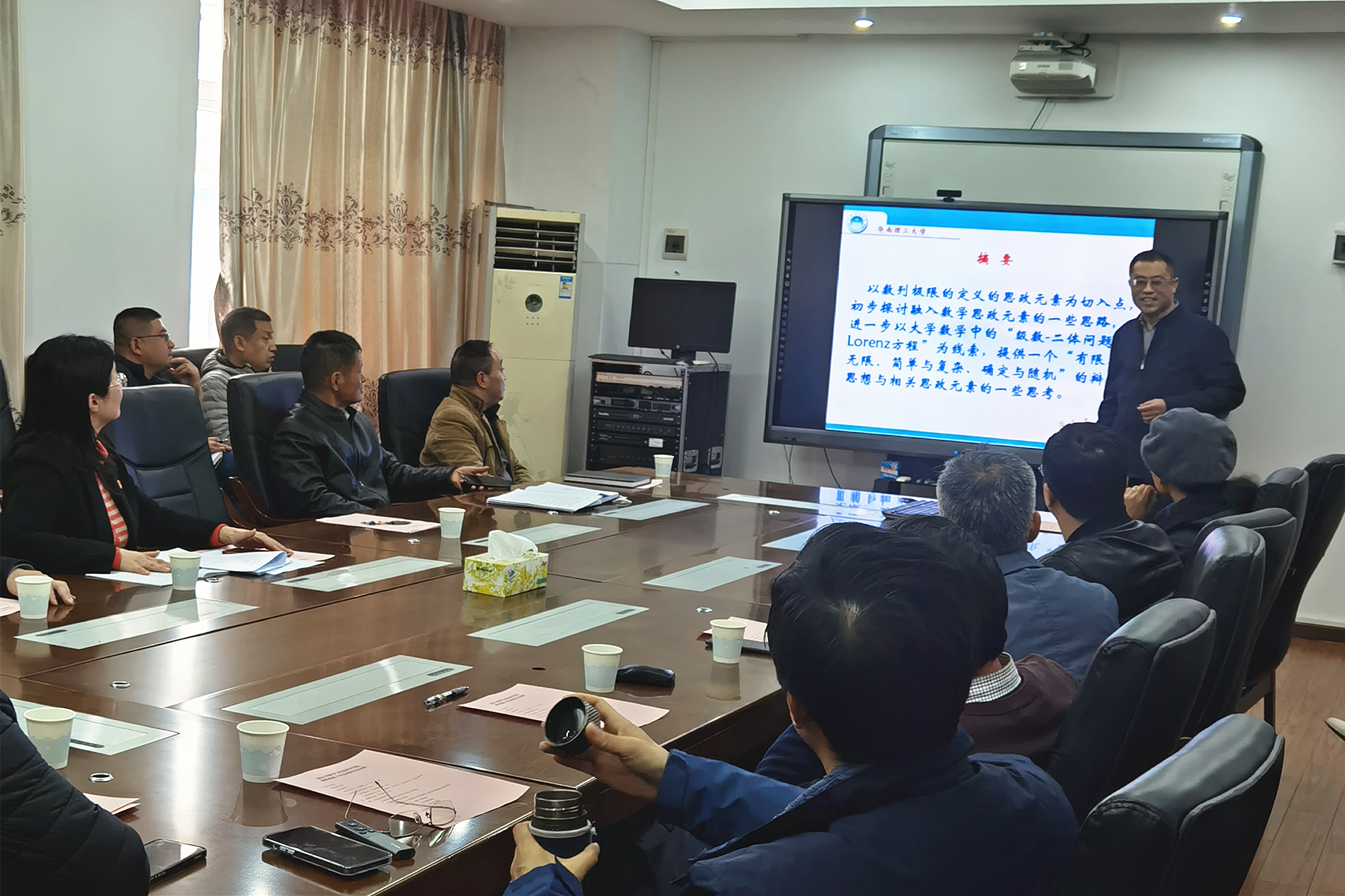 杨启贵教授做《数学思政元素初探—以“数列-级数-二体问题-Lorenz方程”》的专题报告,以数列极限的定义的思政元素为切入点,初步探讨融入数学思政元素的思路,提出要将专业教育与思政教育有效融合。曹广福教授以《课程思政散思-数学的真善美》为题,介绍了课程思政的内涵、目标、实施,鼓励老师们要善于挖掘数学中的真善美。王友德教授从长方形的面积出发引申出实数的定义,再从屠呦呦获得诺贝尔奖的事例,强调教师在专业教育中要积极引导学生注重培养科学精神的培养,永攀知识高峰。大学数学部主任冯永平教授分享了自己及团队开展“课程思政”的经验和体会,建议老师们改进教学手段,在课堂教学中自然地引入思政内容。