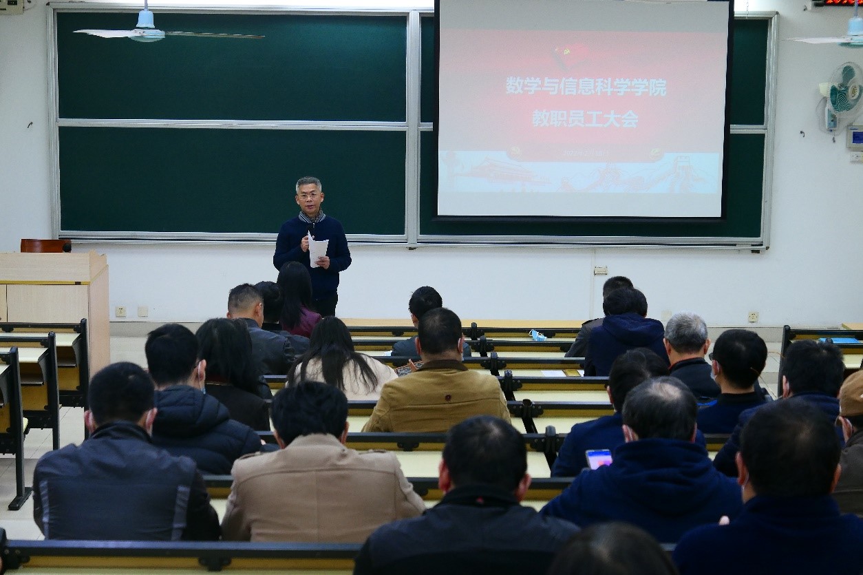 会上,院长彭济根教授传达了学校中层干部大会会议精神。他表示,学院将认真贯彻落实学校会议精神,全面加强党的领导,贯彻党的教育方针,落实立德树人根本任务,深入落实“1+2”高质量人才培养工程,全面推进“2+6”学科与科研创新平台建设,协同推进数学一流学科和ESI指标建设,做好教育部重点实验室申报,着力提升教师和管理服务人员能力水平,进一步提高学院科研水平和学生考研率,为全面推进学校“十四五”规划和省市高水平大学建设任务贡献学院智慧和力量。