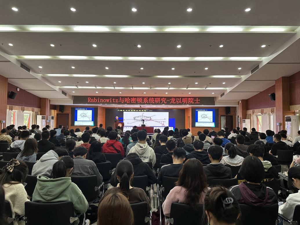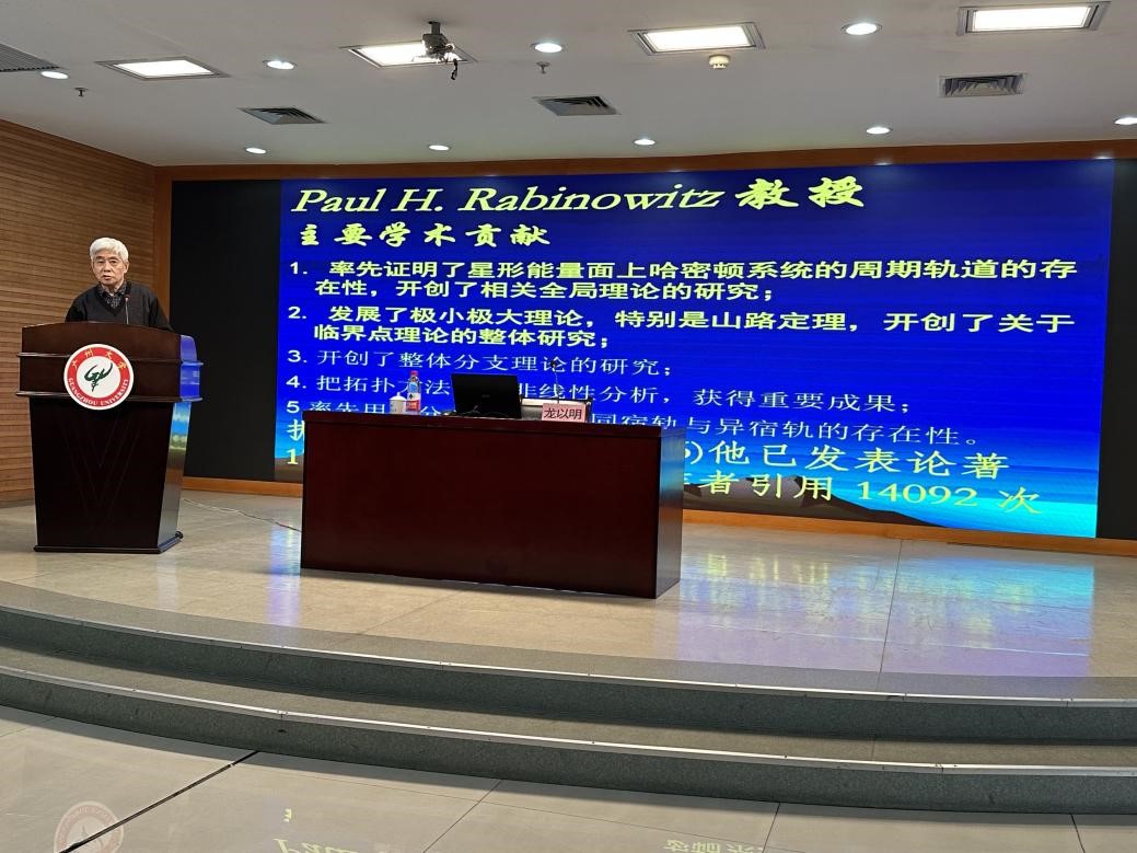 龙以明院士首先以国际著名数学家Paul Rabinowitz教授的科研成长经历为背景,呈现了这位教授对哈密顿系统理论的发展做出的开创性杰出贡献。其次他简要讲解了哈密顿系统与其变分方法的基本原理和Rabinowitz教授与人合作建立的山路定理的图解证明思想。然后介绍了哈密顿系统给定能量面上的周期轨道问题和Rabinowitz教授在此课题研究中的开创性贡献及该领域的后续发展。最后龙老师鼓励青年数学家和学生们学习数学要打好基础,理解好数学的基本概念,学习Rabinowitz教授的创新精神,刻苦钻研。同时期待年青一代要树立长远的目标,瞄准本领域的重大课题深入学习与开展科研工作,努力在所从事的相关领域科技研究工作中获得新成果、建立新方法和新理论,乃至开创新的研究领域。