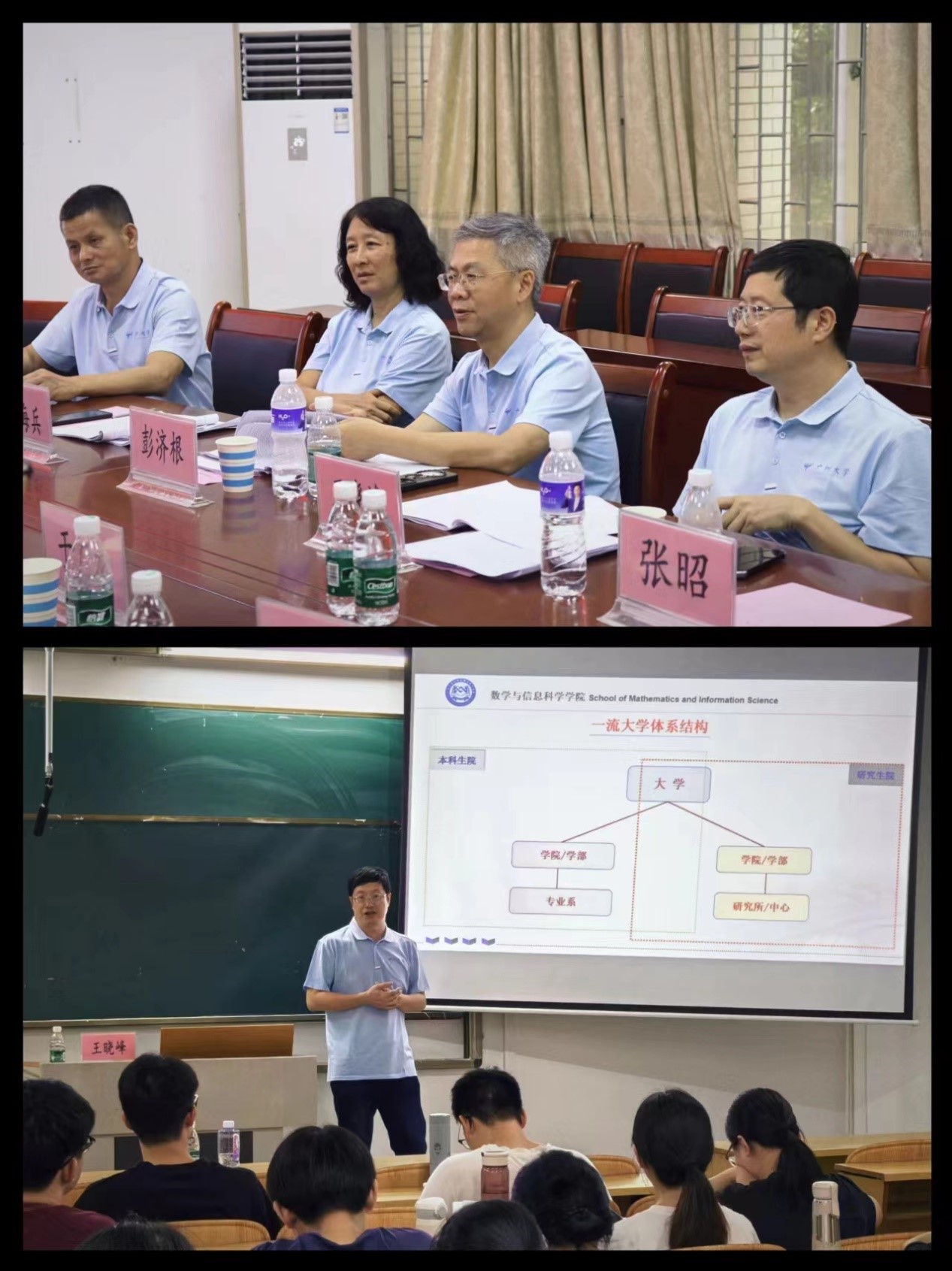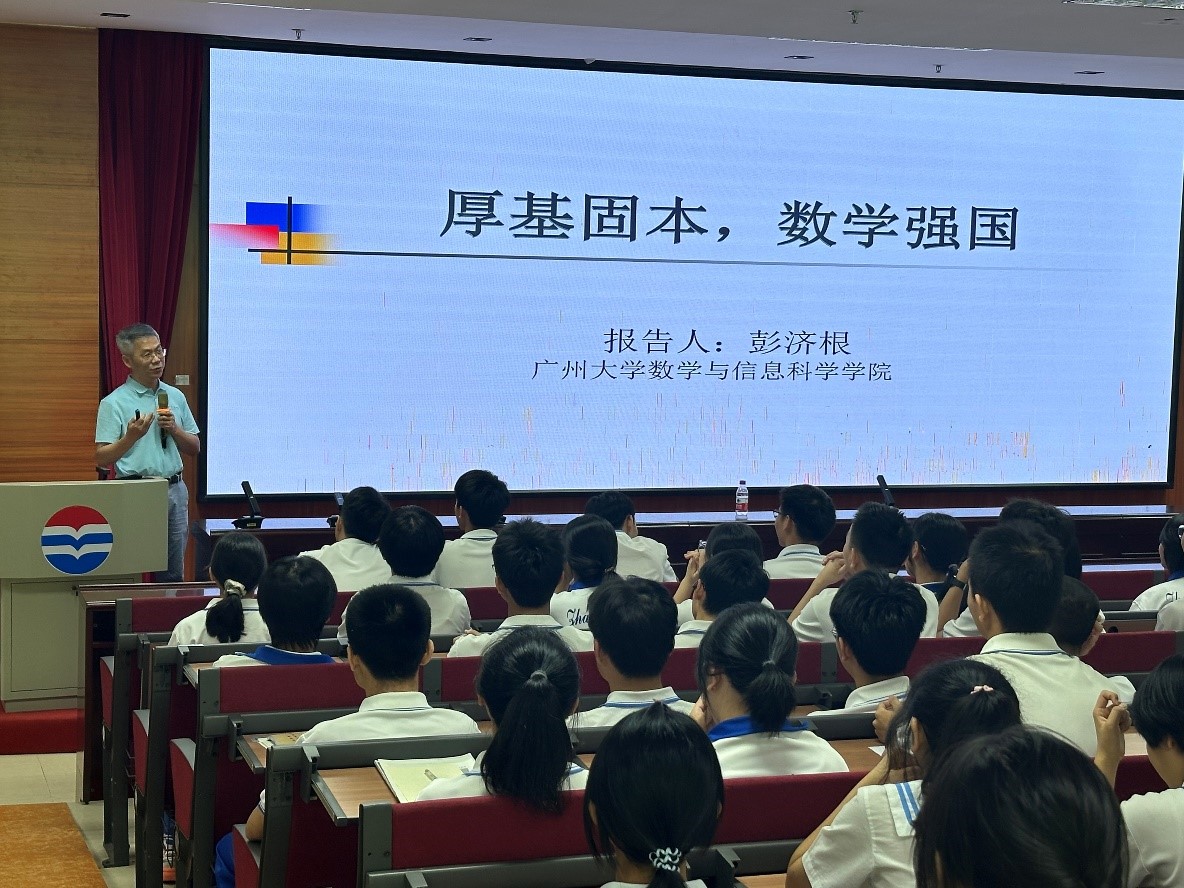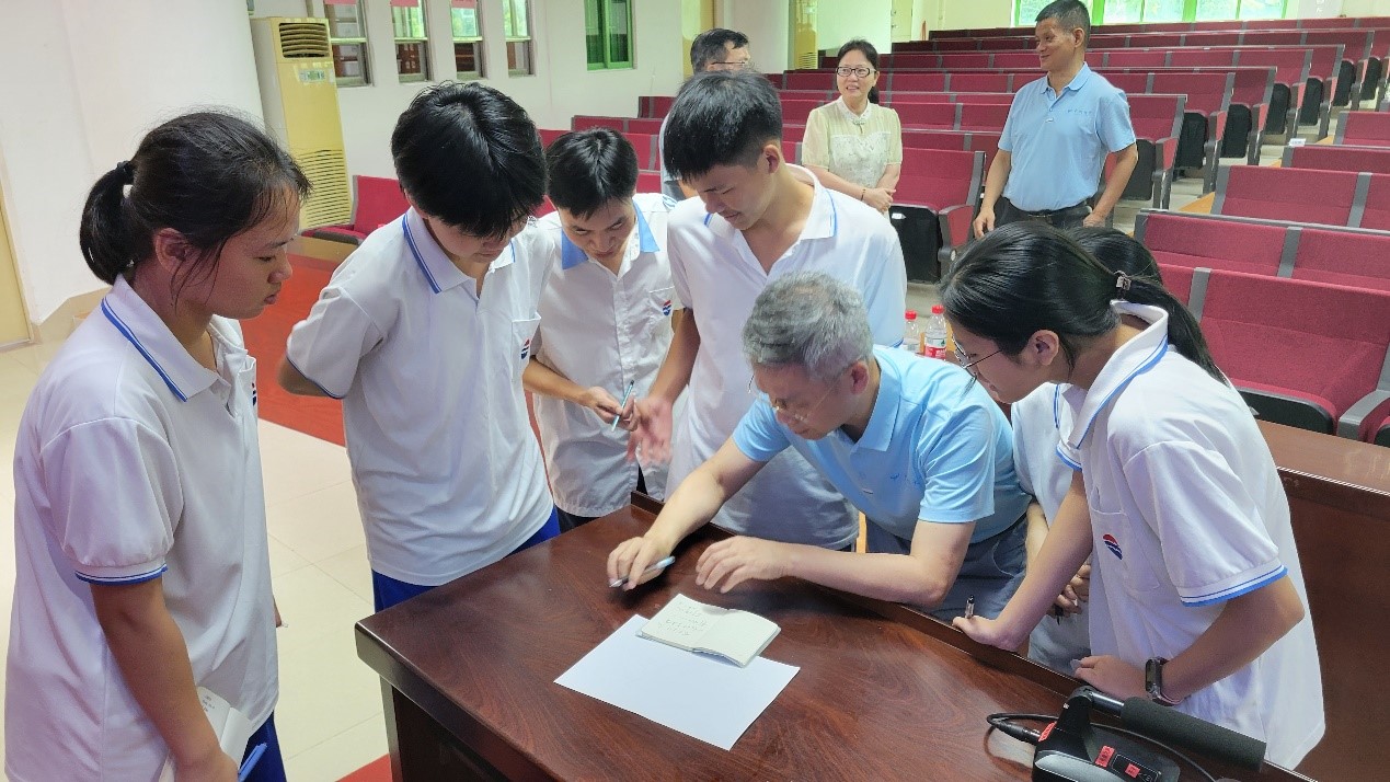 在湛江二中,彭济根院长面向150多名学生,以“厚基固本、数学强国”为题作了一场非常精彩的科普演讲。他从“什么是数学?数学的作用与价值是什么?”为切入点,讲述了在人类所经历的六次科技革命中数学所发挥的巨大的积极作用。他说,人工智能、大数据的核心就是数学,未来科技的进步一定是建立在数学研究的基础上的。他鼓励同学们努力学好数学,培养对数学的兴趣爱好,锻炼自己的数学思维,为迎接人工智能时代的到来打下坚实的科学基础。彭院长渊博的数学知识、缜密的科学逻辑、前瞻的研究视角,赢得了在场的学生热烈的掌声,演讲结束后同学们纷纷请彭院长签名留念,表示要继续好好学习,争取考上国产探花