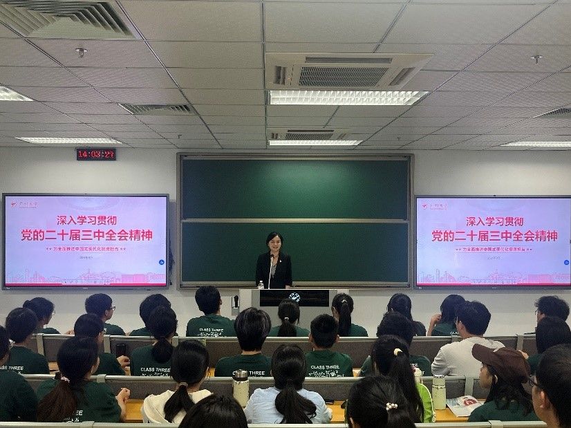 课上,何晓晴副校长带领同学们回顾了党的十一届三中全会、党的十八届三中全会、党的二十届三中全会的相关情况,并阐述了历届三中全会的重要意义。其中,她重点介绍了今年召开的党的二十届三中全会,以及会上审议通过的《中共中央关于进一步全面深化改革、推进中国式现代化的决定》,要求要准确把握进一步全面深化改革的总目标、重大原则和重大举措。