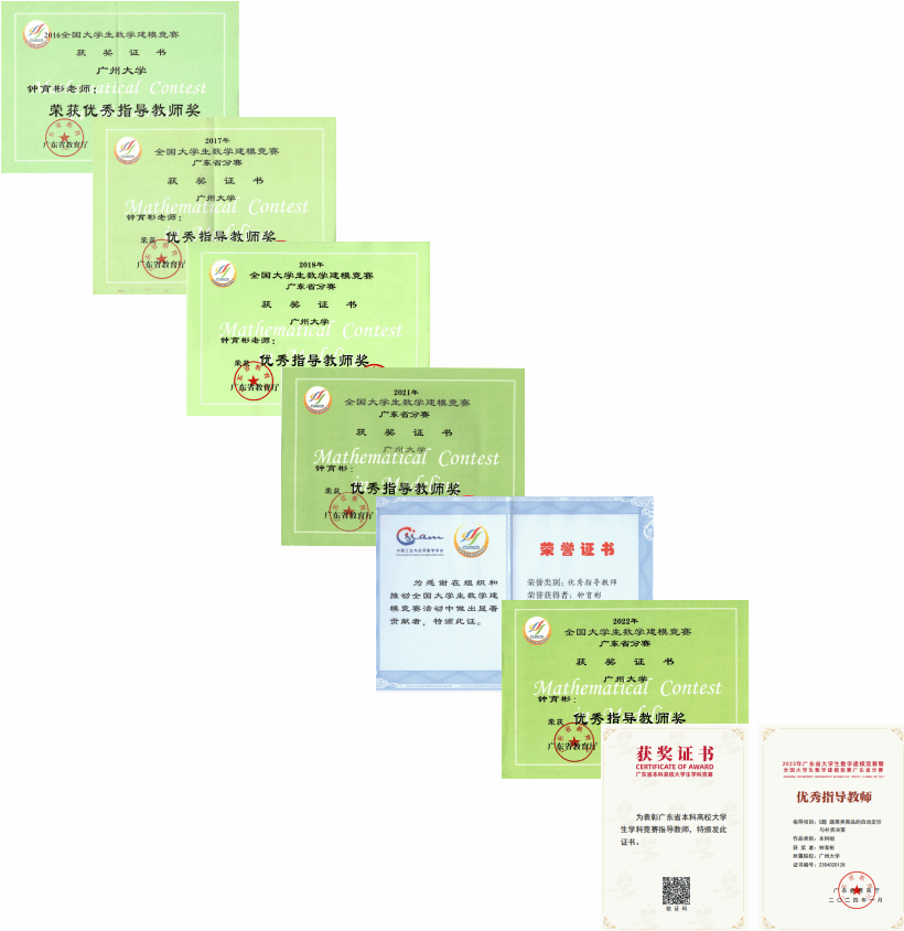 的数学建模比赛成绩取得重大突破,获奖队伍逐年增多。在国家教育部牵头主办的“高教社杯”全国大学生数学建模竞赛中,他指导学生获得国家一等奖&广东省一等奖9项、国家二等奖&广东省一等奖16项、广东省一等奖10项,2016-2023年连续7次获得广东省教育厅颁发的数学建模优秀指导教师奖。
