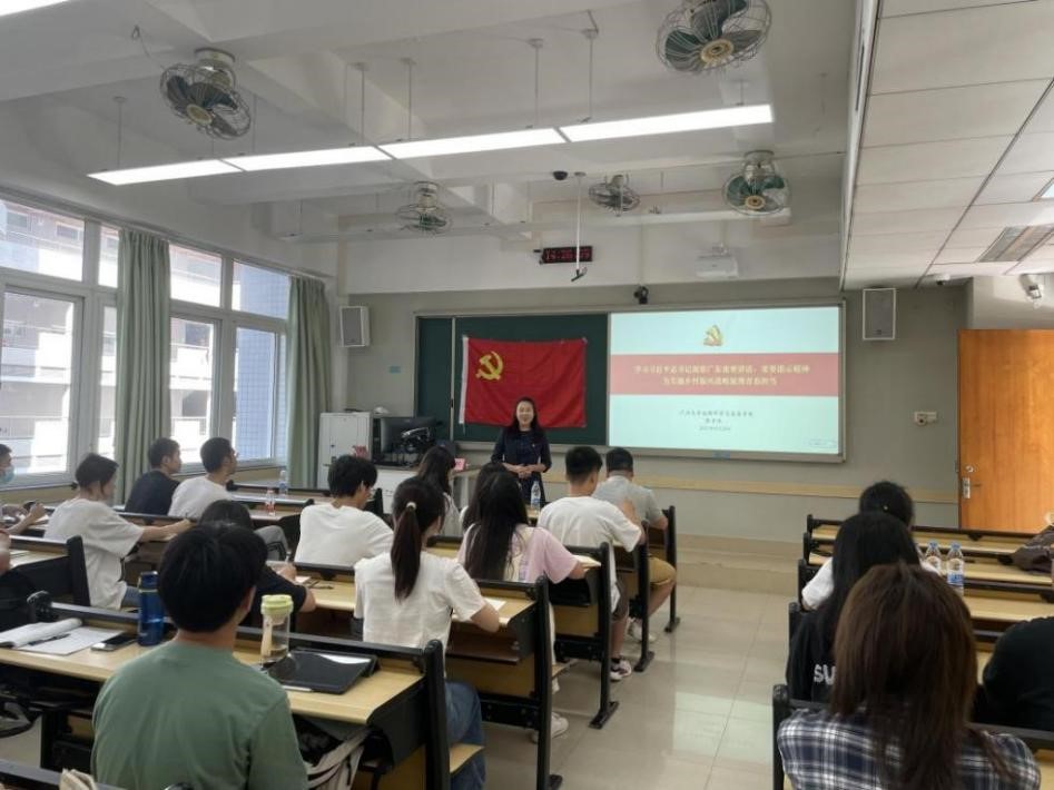 开班典礼结束后,地理科学与遥感学院党委书记陈宇红副教授带来“学习习近平总书记视察广东重要讲话、重要指示精神,为实施乡村振兴战略展现青春担当”主题党课。
