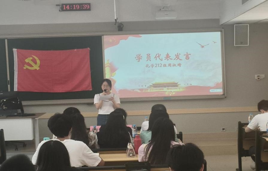 学员代表化学212周淑琦代表全体学员表达了端正学习态度、严格要求自己的决心,并表示将通过培训班的学习,主动完善自己,有所收获,有所提高,做一名思想政治素养高,文化知识学得好的优秀青年。