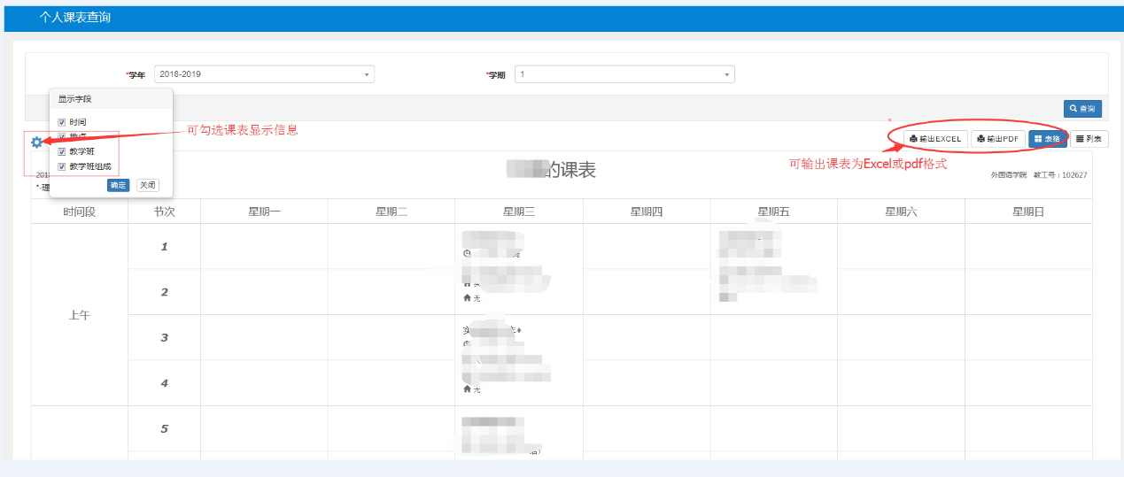 查询、导出详细课表:可直接点击部分课表,进入“个人课表查询”,或点击“信息查询-》个人课表查询”,详细课表如图K-2所示。1)可点击左侧的“小齿轮”,增加或减少课表的显示信息,默认显示“时间、地点、教学班组成”;2)点击右侧的“输出Excel”或“输出PDF”格式,可保存个人课表至本地。