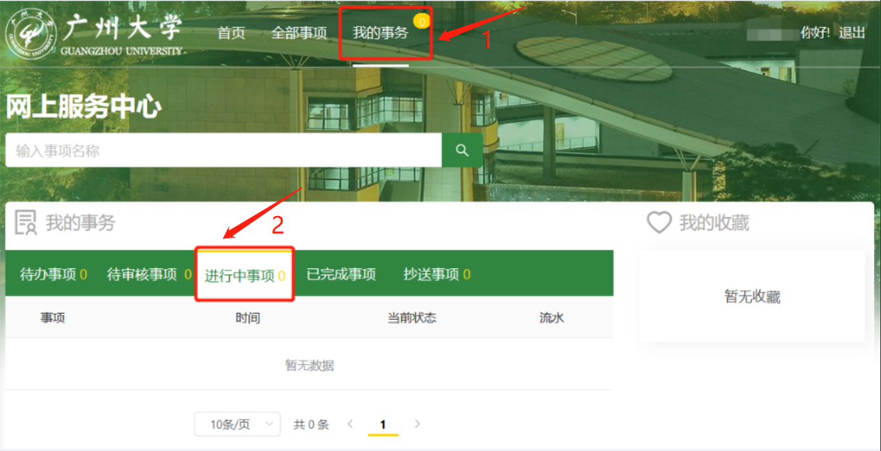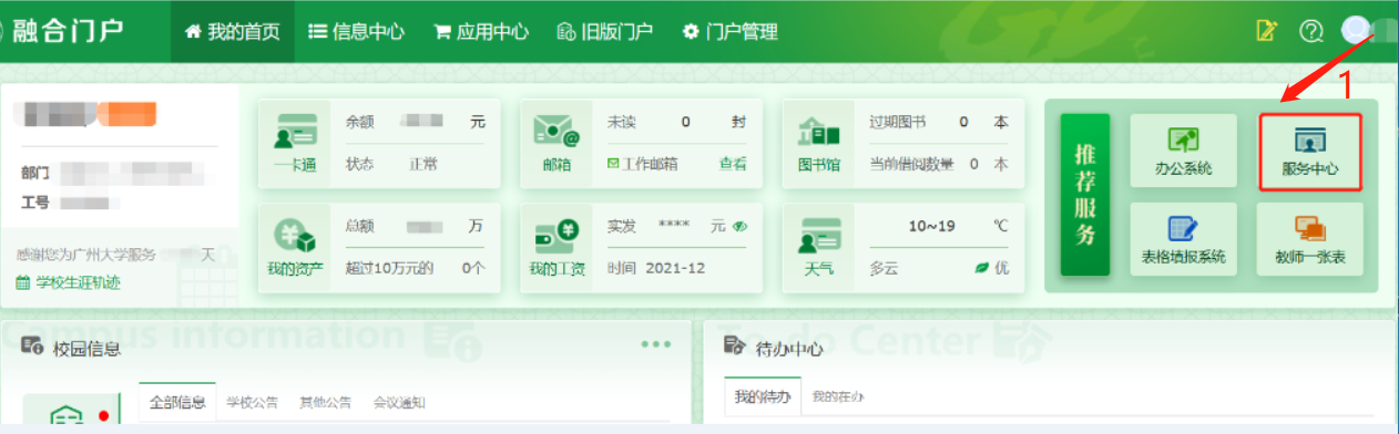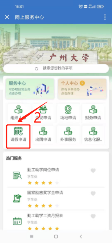 1. PC端:登录“数字广大”进入融合门户,点击右上角推荐服务中的“服务中心”,点击“全部事项”→点击“人事处”→选择“教职工请假(离穗)申请”发起流程。