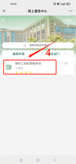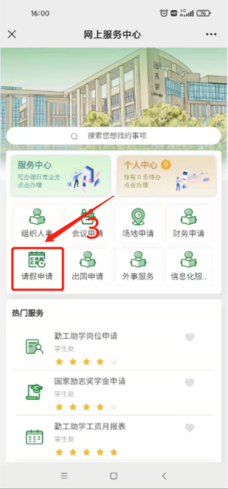 2. 手机微信端:登录手机微信→点击“通讯录”上我的企业及企业联系人“国产探花 ”进入企业微信→点击“服务大厅”进入网上服务中心→点击“请假申请”→选择“教职工请假(离穗)申请”发起流程。