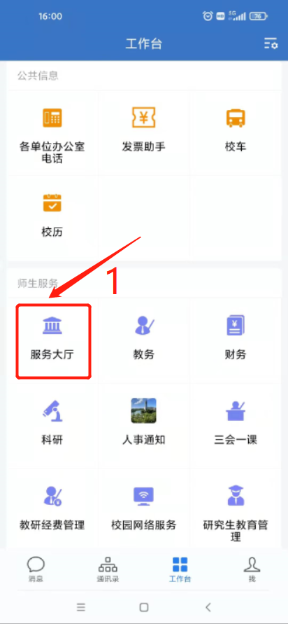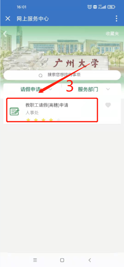 3. 企业微信App端:登录手机企业微信→点击“工作台”上的“服务大厅”进入网上服务中心→点击“请假申请”→选择“教职工请假(离穗)申请”发起流程。