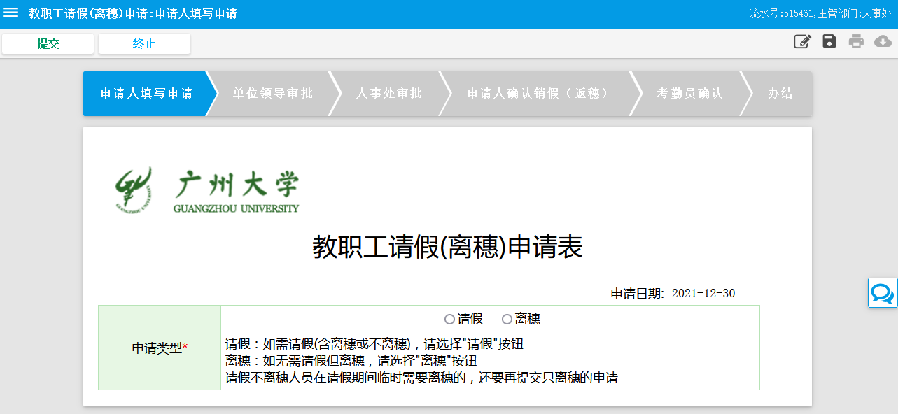 国产探花 教职工请假(离穗)申请流程使用指引