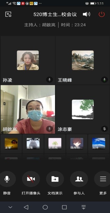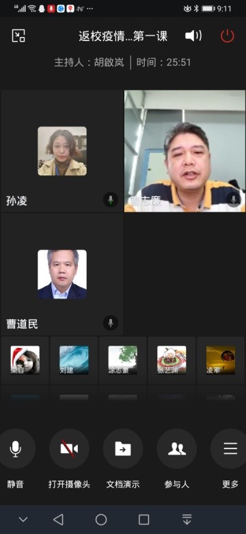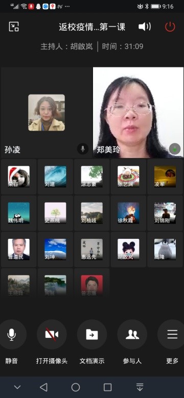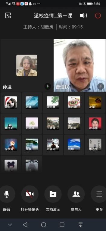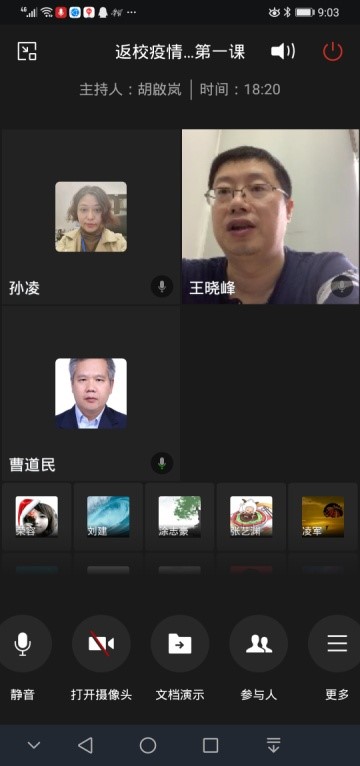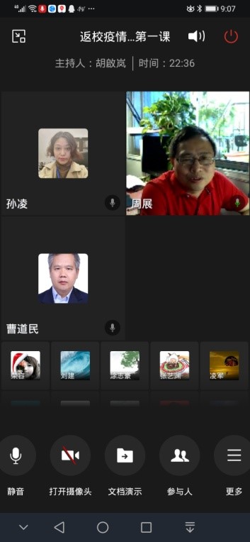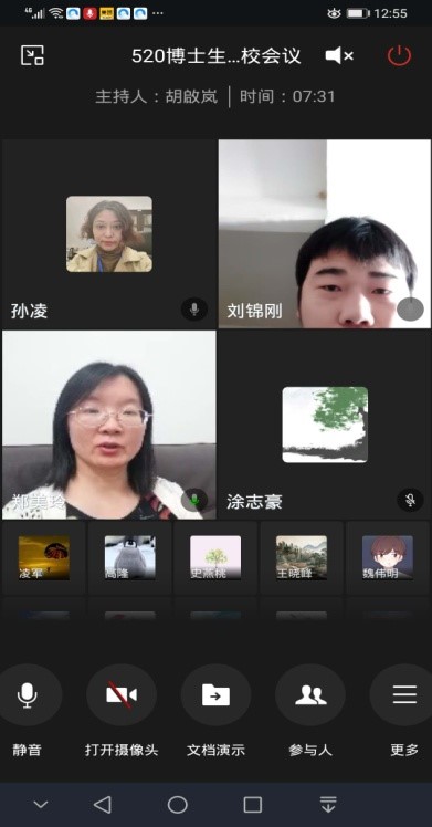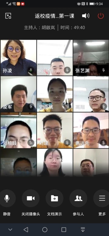 的十三位博士生全都顺利通过检测进入学生宿舍做好安顿,总体当天返校工作平稳、有序、顺利的完成任务。为了能让返校的博士生尽早了解学校防控管理的要求和尽快顺利投入正常的学习生活,5月22日上午九点学院面向全体返校博士生开展“返校疫情防控第一课”,参加的学院领导老师包括:曹道民院长、郑美玲书记、周展副院长、王晓峰副院长、孙凌副书记,实验室曾志廉副主任和辅导员胡啟岚老师,会议由孙凌副书记主持。