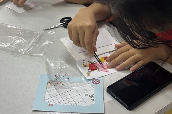 第四站是进行非遗岭南押花技艺学习及创作,同学们在听完授课老师对非遗岭南押花技艺的背景、特点、价值、制作的基本步骤以及注意事项的讲解后,通过自己天马行空的想象开始了自己押花之旅,用自己灵巧的双手制作出属于自己的作品,并向同学们介绍了自己的作品。